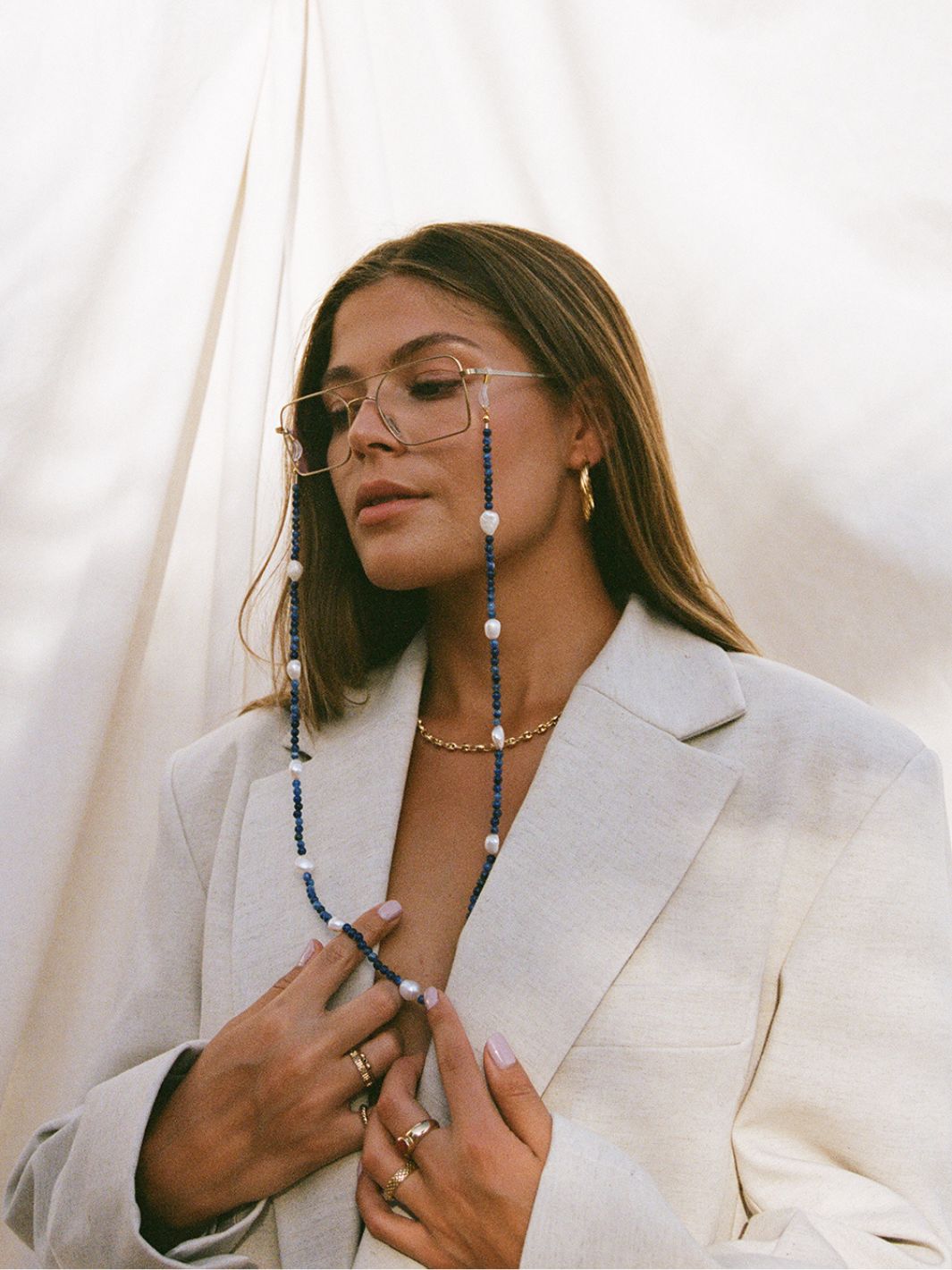 The name of this blue gemstones beauty is actually Lapis Lazuli, how cool is that! This glasses cord is a real eyecatcher and the azure blue color is so intense. The gemstones represent spiritual power, wisdom and inner peace. A very powerful sunny cord if you ask us. The Lapis Lazuli Gemstone is associated with strength, courage, royalty, wisdom, intellect and truth.