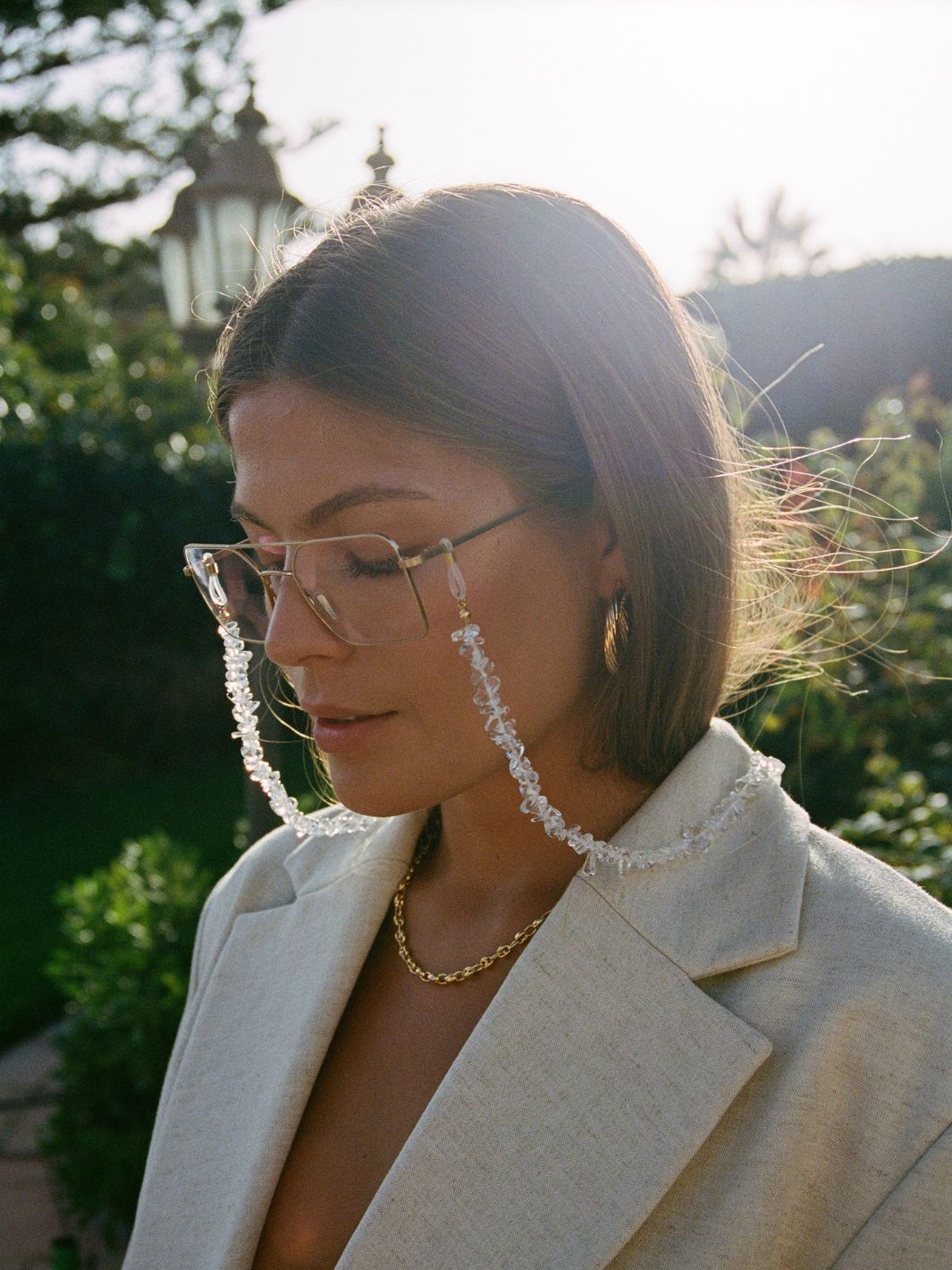The Olaya glasses cord is made out of real transparant crystal, which is believed to have the ability to amplify energy by absorbing, storing, relating and regulating it.. Take a closer look and you can see through the crystal stones. Wear the sunny cord on your glasses with the sun reflecting on your crystals. They will sparkle as never before.