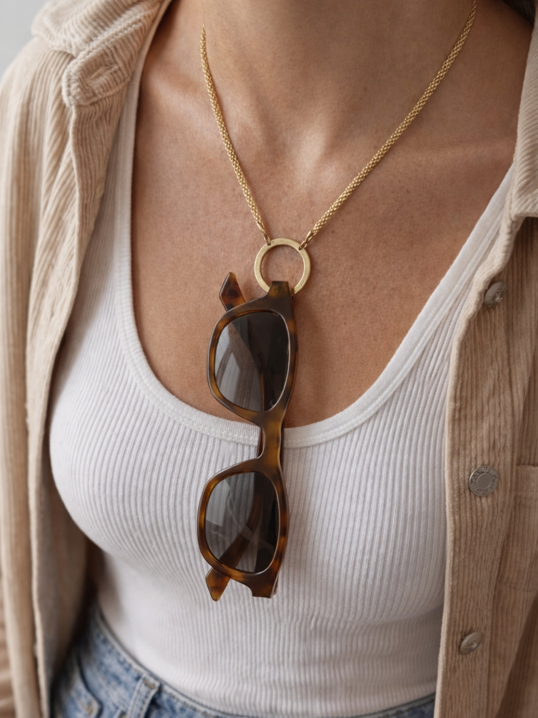 The Lux glasses holder necklace is a refined essential for everyday wear. This sunglasses chain is reimagined as a necklace within our Ring Edit collection. An 18K gold plated stainless steel chain. No extra details, just a smooth, polished finish that catches the light in a subtle way. Designed for everyday wear, with a more premium feel. Available in both long and short lengths.