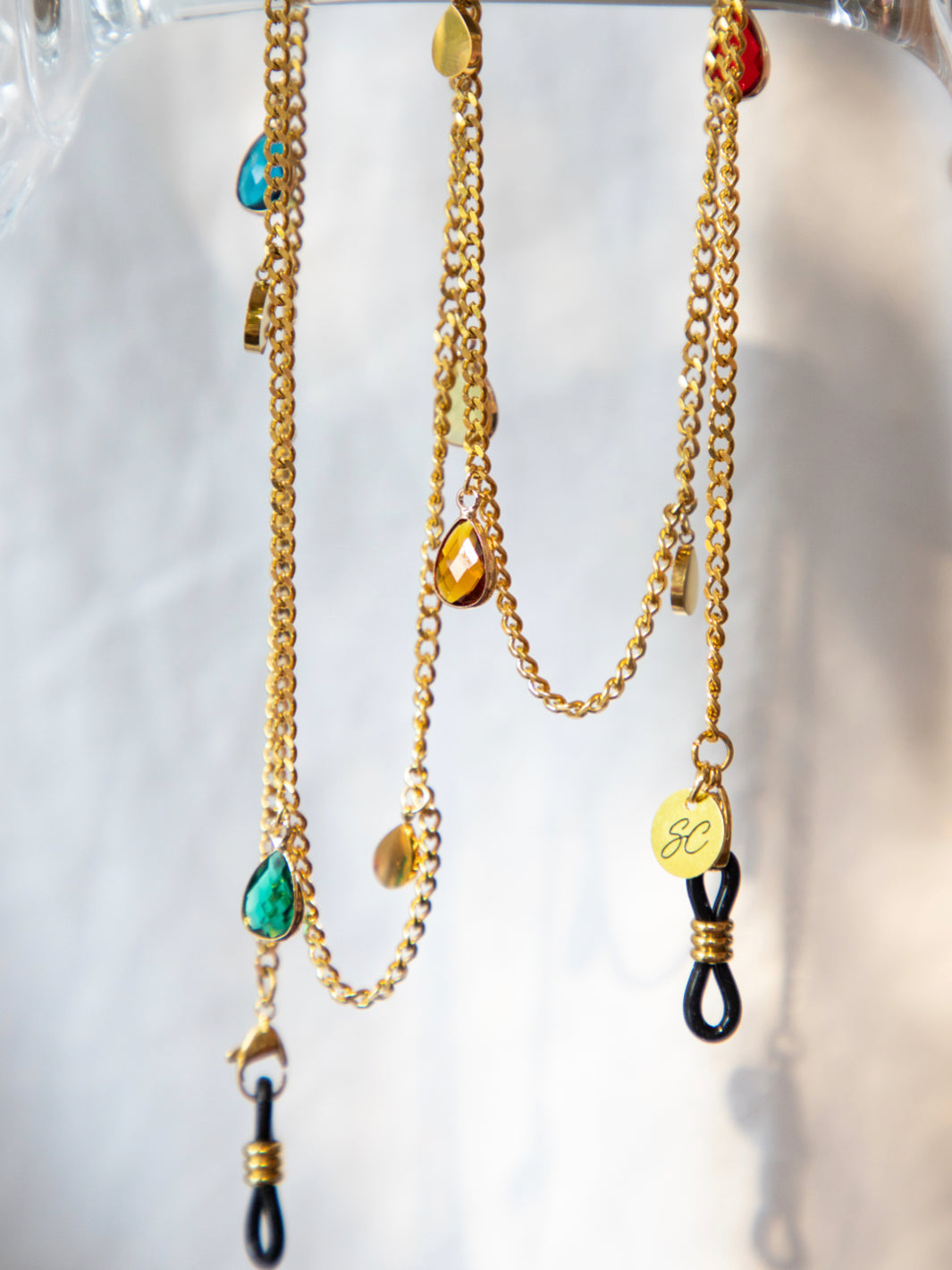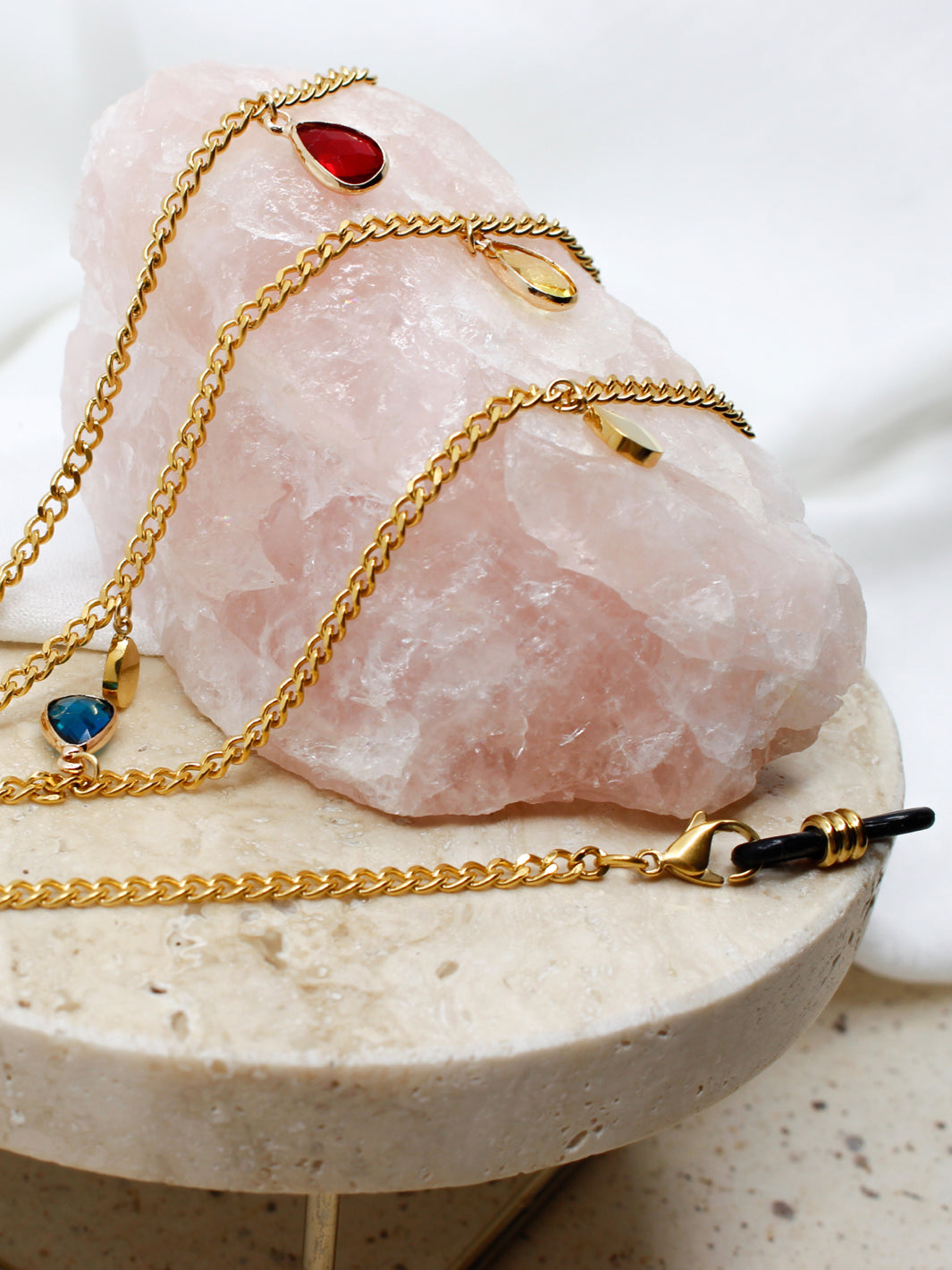 The Ella sunglasses chain is subtle and elegant. This stainless steel chain is available in three different colours; gold, silver and rose gold. The sunny cord has transparent sparkling stones in different colours, so there is always a colour that matches your outfit.