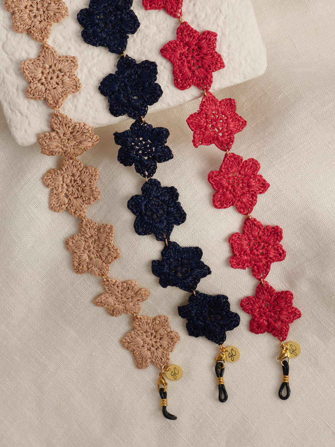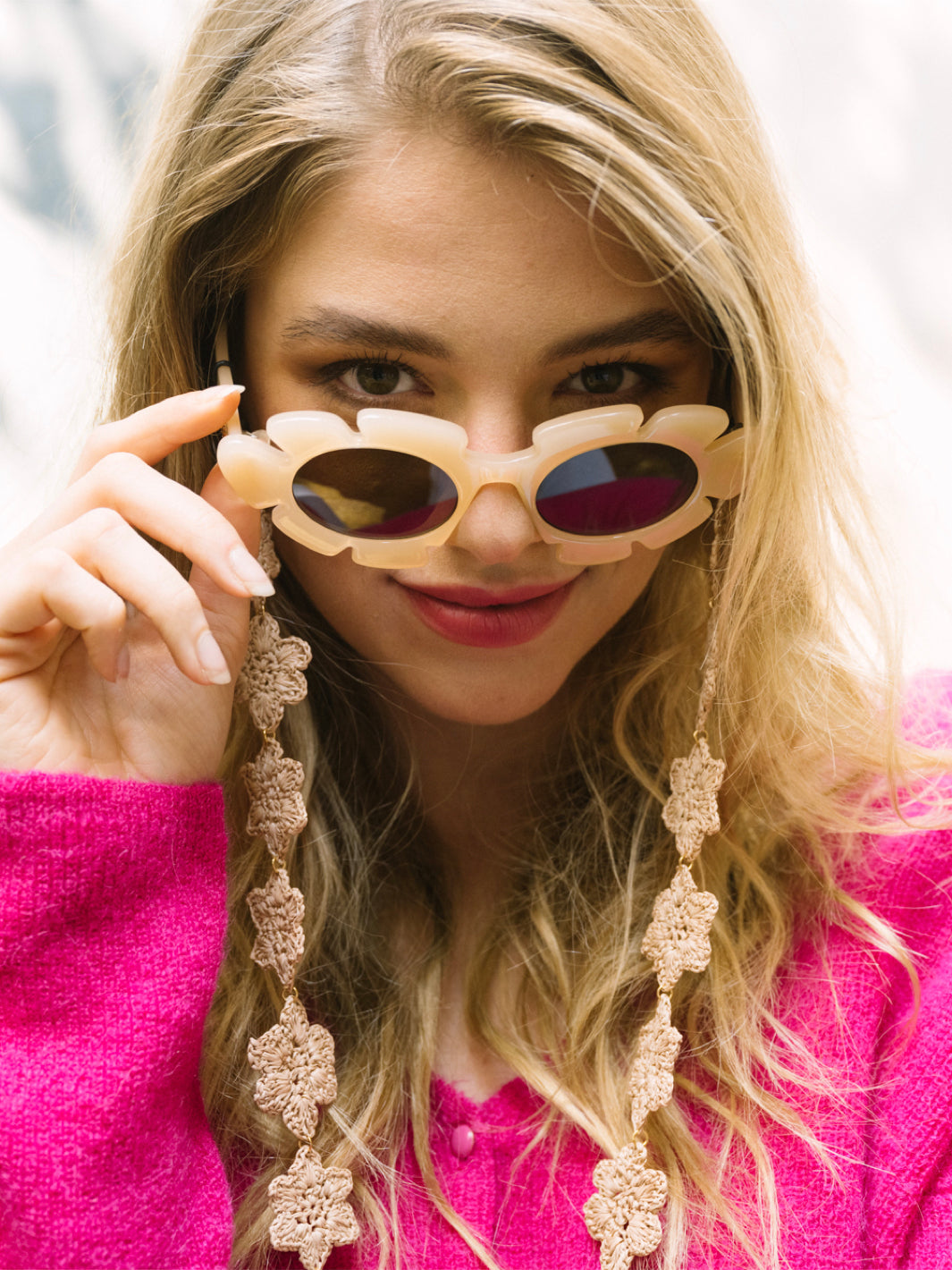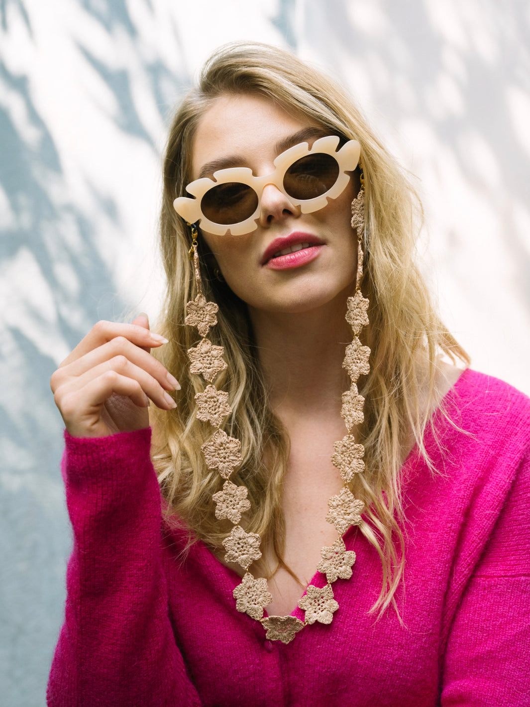 Discover the Lolita, floral-colored sunglasses strap consisting of handmade braided flowers, being the perfect accessory to pimp your glasses and steal the show this summer! These Sunny Cords are available in three stunning colors: raspberry pink, blue and cream beige.