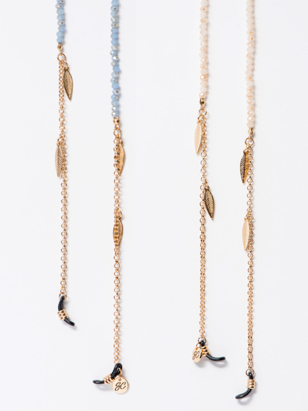 This beautiful sunglass cord barely needs a description. Featuring effortlessly feminine handmade crystal beads that come in either hues of dainty mixed blue or sweet peachy pink, this glasses cord is a statement of airy femininity. Wear it to dress up any outfit.