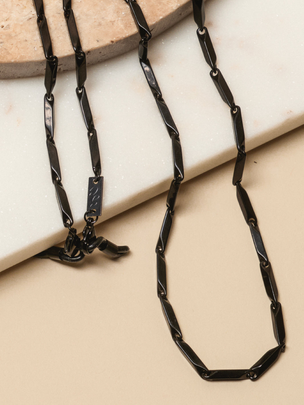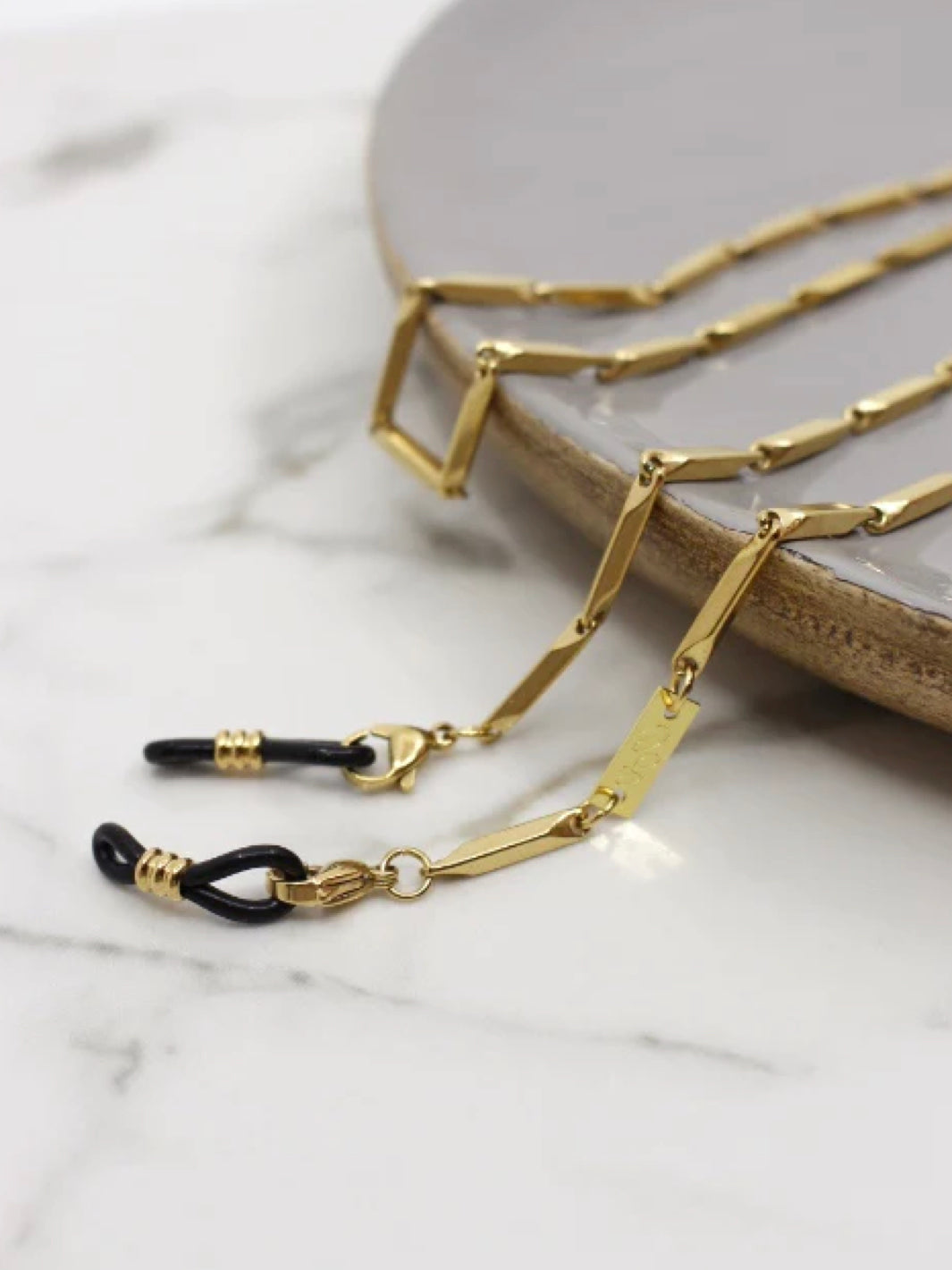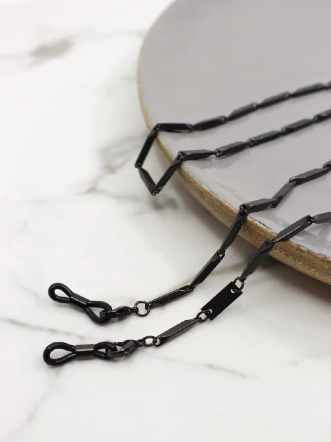 Let us introduce you to Jake, our cool and fashionable glass chain. The Sunny Cord can be fixed easily to your glasses by using the rubbers that are placed at the end of the chain. It will keep your glasses in place, so that you will never have to search for your glasses again. The Jake has metallic squared shapes with sightly rounded edges to add some finesse. The Jake is available in pitch black or gold. Which one will you choose?