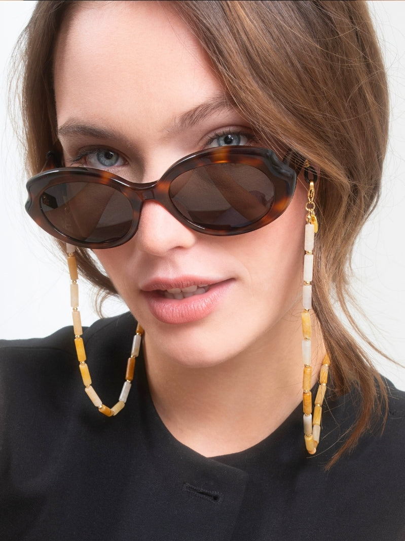 Bring natural elegance to your style with the Wendy glasses chain. Combining smooth natural cones, discs, and DQ gold beads, Wendy exudes effortless charm with soft beige tones. It’s a delicate statement for those who love organic textures and golden accents — the perfect sunglass chain for understated sophistication.